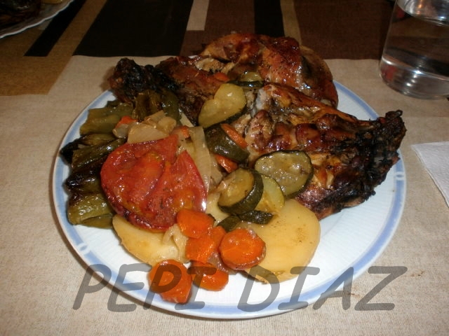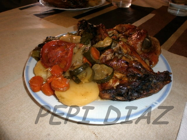 Una vez colocado el pollo, se le echa el vaso de vino y el1/2 vaso de agua caliente con la pastilla de caldo desecha en el agua.yo le eché por encima orégano y perejil, pero eso es al gusto de cada uno,bueno pues ya esta listo para entrarle en el horno,le pondremos a unos 180 grados y de tiempo unos 45 o 50 minutos,según el horno de cada uno,de vez en cuando lo vas viendo y le vas dando la vuelta al pollo para que se dore por los dos lados,a mi familia le gusta el pollo muy dorado así que a gusto no hay nada escrito, jejeje.