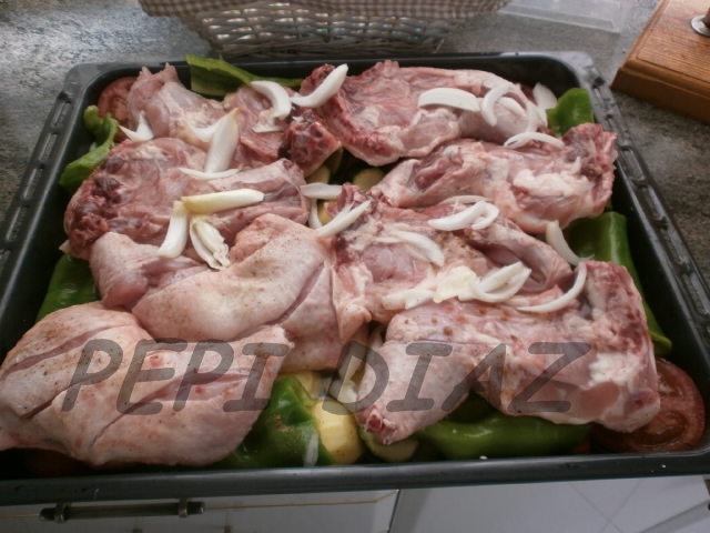 Lo primero ponemos el horno a180 o 200 grados para que se valla calentando,lavamos las patatas y la pelamos y cortamos a rodajas grandes y si son pequeñas pues las cortamos por la mitad,en la bandeja del horno ponemos una base de patatas,seguimos cortando las verduras y poniéndolas en la base de la bandeja,dejamos una mitad de cebolla para el final,una vez cortada la verdura en rodajas y puesta en la bandeja,salpimentamos el pollo y lo colocamos encima de la verdura,y cortamos la cebolla que dejamos en rodajas y las ponemos encima del pollo.