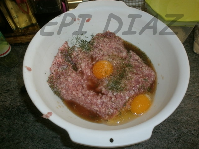 Ponemos en un bol grande la carne picada y le echamos los dos huevos, la sal y la pimienta molida al gusto,el 1/2 vaso de vino,el perejil picado y los dientes de ajo pelados y picados,si no os gusta mucho el ajo,cosa que me pasa a mi, suelo echarle del ajo en polvo que se compra en botecitos.