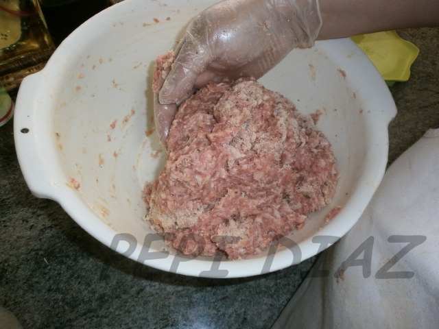 Bueno pues con todos los ingredientes incorporados empezamos a mover la masa con las manos asta que este todo bien mezclado,una vez que esté todo mezclado vamos echando el pan rallado poco a poco para espesar la masa de carne,