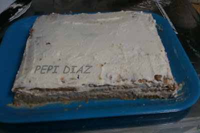primera capa de galletas, mojadas previamente en leche y canela. No