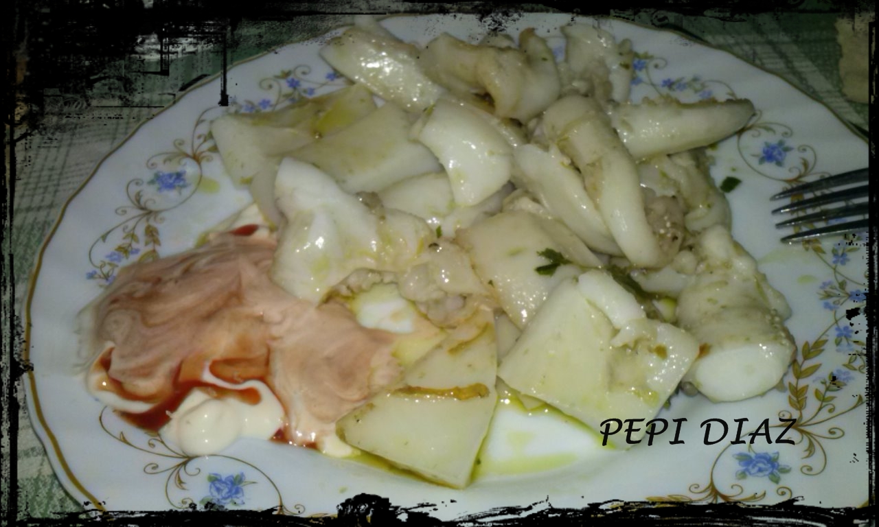 Ponemos la sartén grande o placa de plancha a calentar y hacemos la sepia,por un lado y por otro,de vez en cuando le rociamos con el macerado,una vez echa la sepia se trocea en la fuente y le rociamos por encima el macerado,no todo por que sino queda muy aceitoso,jeje.